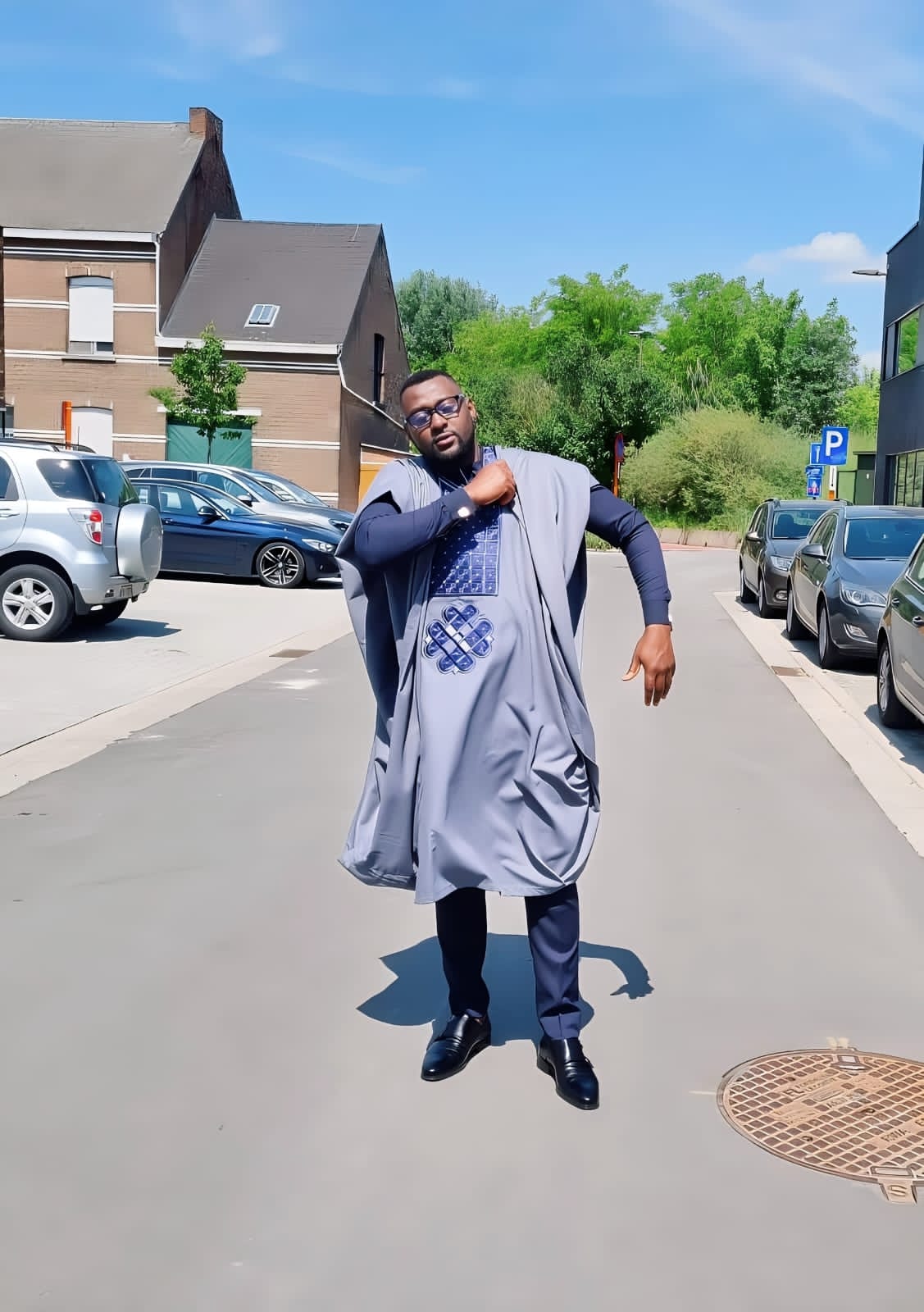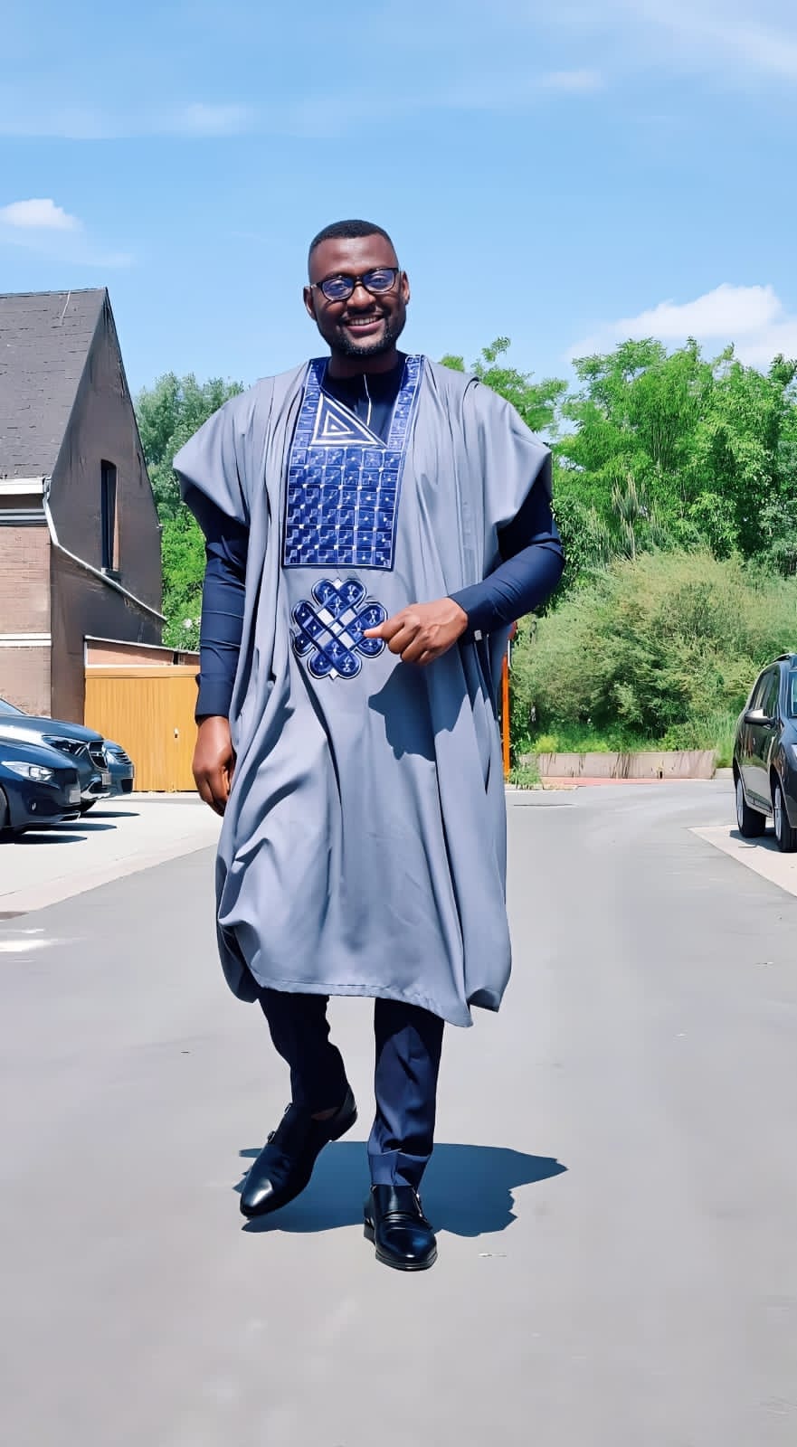 A bold blend of grey and blue-black, this Agbada commands attention with embroidered grace and Afro-royal pride.